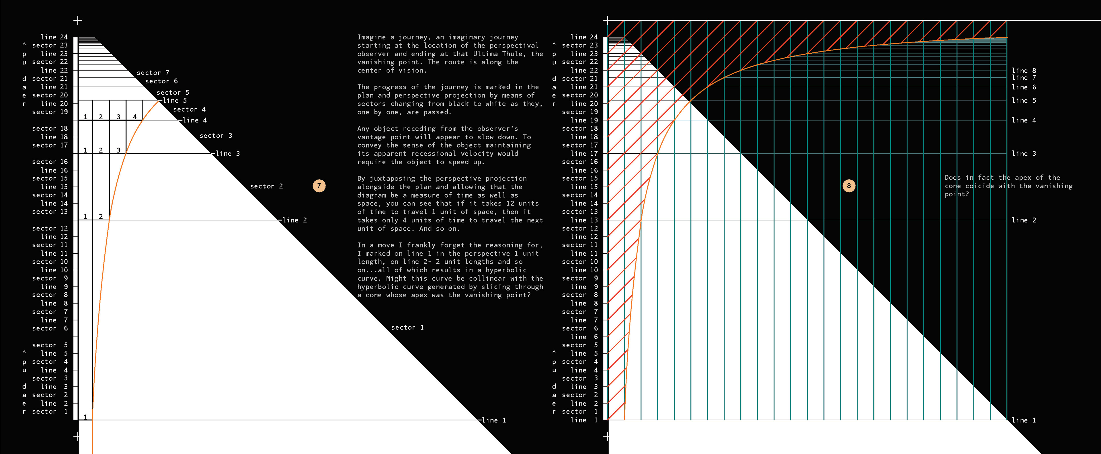 Digital drawings made in collaboration with Michael Webb, of Archigram, for Centre de design de l’UQAM’s "Around Drawing" exhibition in Montreal, 2022. These diagrams, made with the instruction of Michael, walk the viewer on an "imaginary journey" towards the vanishing point. They further investigate Michael's life long study on perspective.
